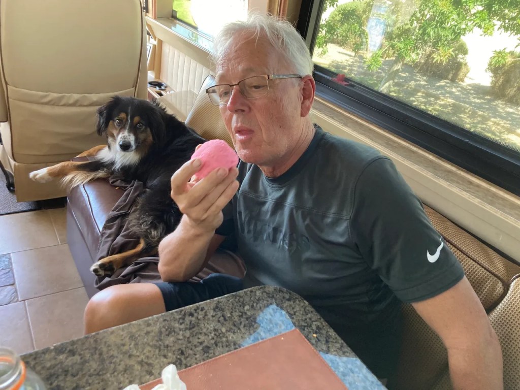For lunch we had our Grandson Quinn’s (and Grandma Linda’s) favorite sandwich: a fluffer nutter! Which is peanut butter and marshmallow cream on white bread with nacho cheese Doritos! We had to pick just the right entree to warrant our dessert: ever since our first road trip, more than 22 years ago, we have had a Hostess Snowball as a fun, sweet, completely unexplainable way to kick off the first leg of every road trip. The tradition continues. And we’ve introduced it to many of our road-tripping friends!