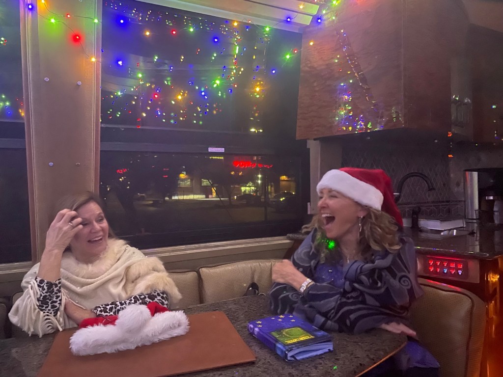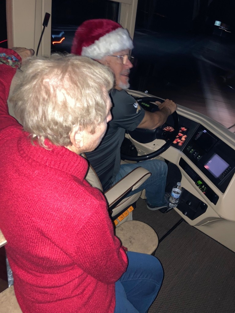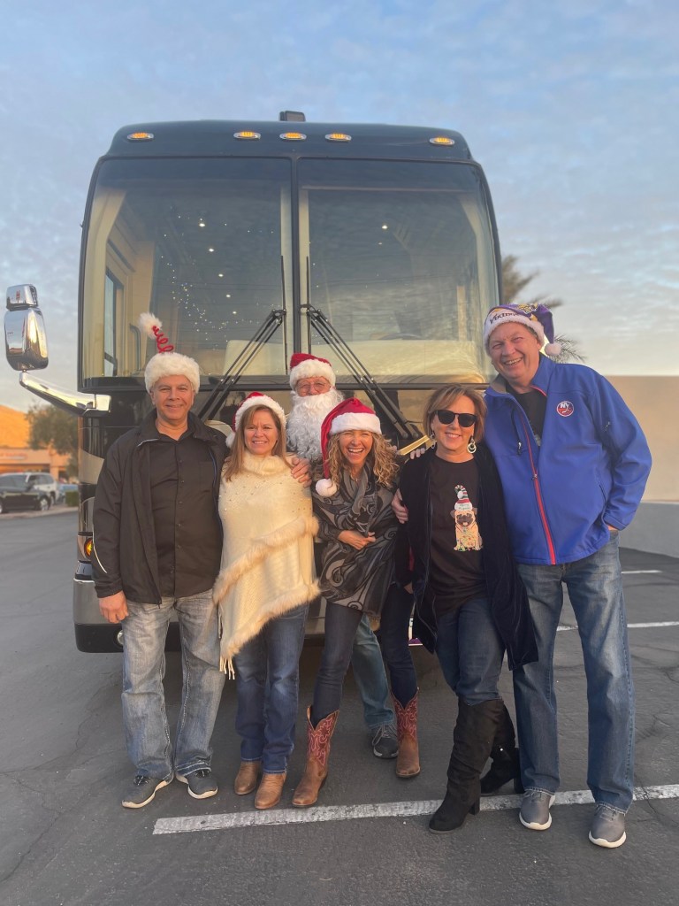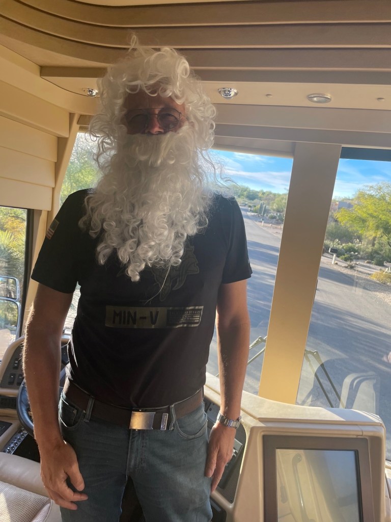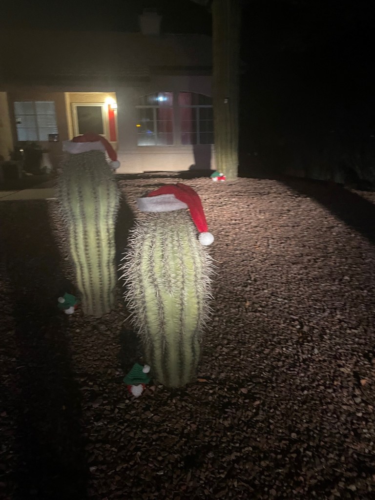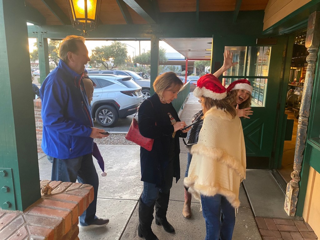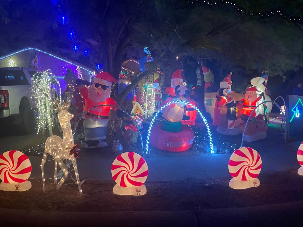 Larry, Joanne, Santa Claus, the birthday babe, Suzanne and Rick (Go Vikings! Boo Jets!) posing in front of Tinkerbell before heading into Oregano’s for pizza!On our way into Oregano’s – ready to eat!!This is when Larry spilled the beans….in addition to being a retired Chicago police officer, he’s now an ordained minister! And he drives a van offering free mammograms (okay, the van part isn’t true… yet…)Happy Birthday to me!And then we hopped into Tinkerbell and started our journey around Tucson looking at Christmas light displays. Joanne and I had lots of good laughs talking about astrology!And Suzanne and Joanne chatted about psychosis, I mean, psychics 😉Lots of houses went ALL OUT on Christmas displays!Sorry for the fuzzy pics – I tried not to use a flash and well… you see what happens. Anyway, Larry and Rick helped Santa Jay navigate 🙂And… even with a flash, it was tough to get a good group shot in front of all the lights. But we had a blast and lots of laughs!Holy Moly! What a display! Now’s a good time to thank Suzanne and Larry for their excellent photography skills documenting our evening!But this Christmas display topped (no pun intended) them all!Intermission… gosh, I hope Jay doesn’t let his real hair grow this much!The next night, we did it all again with more friends! From left to right: Alba, Helen, Santa, Keegan, Brenda, Jason, and George. Alba’s from Italy; Helen and George are from Louisiana/Pittsburgh; Brenda, Jason and Keegan hail from Oregon; and Santa comes from the North Pole!Keegan makes the cutest Santa!Alba helped navigate and kept Jay company in the cab.And… before all of the Tinkerbell festivities began, we kicked off my birthday celebration with a good ‘ole fashioned Axe Throwing contest! (Jay, being from Minnesnowta and accustomed to axes, won). My nephew Ian (from Oregon and going to U of A) hit a bullseye on one of his first throws! And Rick (of the Suzanne and Rick combo) came in second place. He claimed it was his first time throwing an axe but he is from New York City, so one can only assume he carries an axe when he goes to work every morning. What a WONDERFUL birthday it was! Thank you everyone (including family and friends who couldn’t make it to Tucson but who called and wrote in with joyful fishes and slightly tuneful song) for helping me ring in “another year around the sun!”