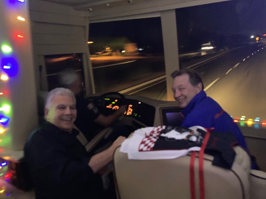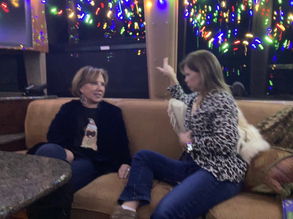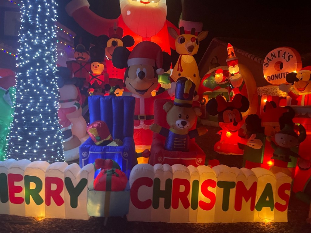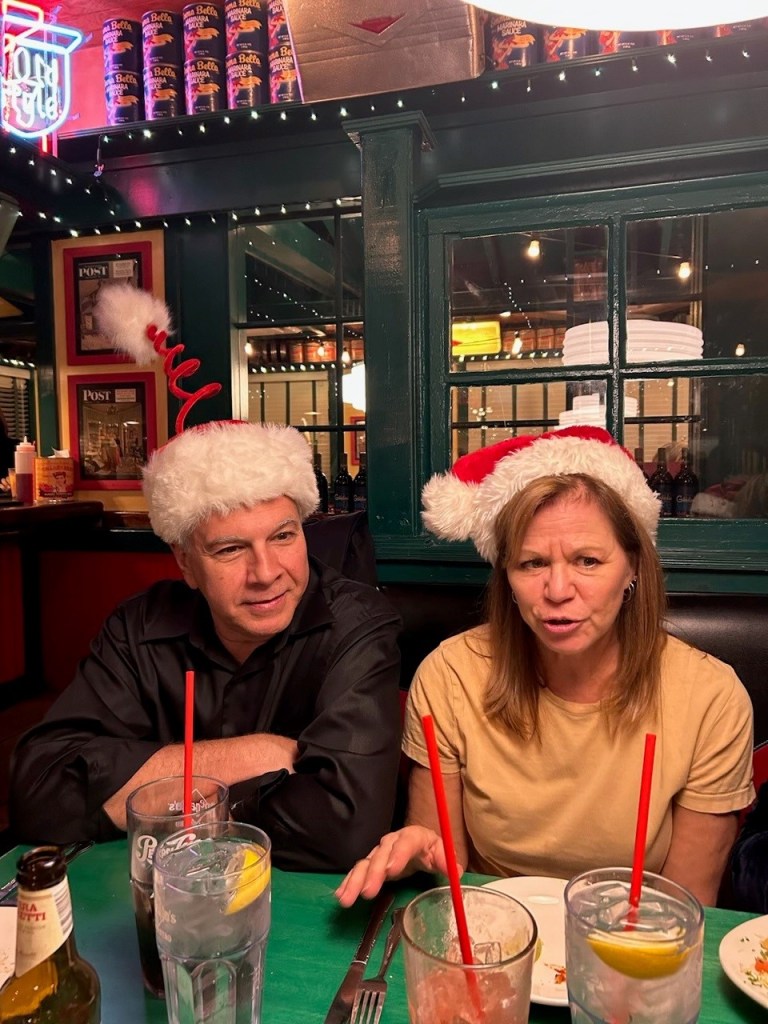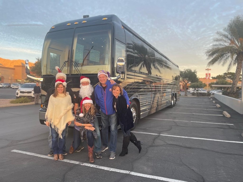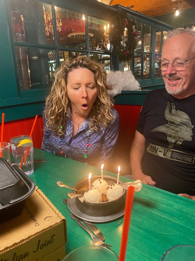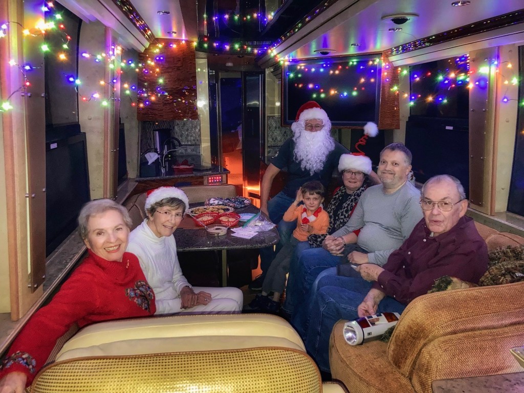 Larry, Joanne, Santa Claus, the birthday babe, Suzanne and Rick (Go Vikings! Boo Jets!) posing in front of Tinkerbell before heading into Oregano’s for pizza!On our way into Oregano’s – ready to eat!!This is when Larry spilled the beans….in addition to being a retired Chicago police officer, he’s now an ordained minister! And he drives a van offering free mammograms (okay, the van part isn’t true… yet…)Happy Birthday to me!And then we hopped into Tinkerbell and started our journey around Tucson looking at Christmas light displays. Joanne and I had lots of good laughs talking about astrology!And Suzanne and Joanne chatted about psychosis, I mean, psychics 😉Lots of houses went ALL OUT on Christmas displays!Sorry for the fuzzy pics – I tried not to use a flash and well… you see what happens. Anyway, Larry and Rick helped Santa Jay navigate 🙂And… even with a flash, it was tough to get a good group shot in front of all the lights. But we had a blast and lots of laughs!Holy Moly! What a display! Now’s a good time to thank Suzanne and Larry for their excellent photography skills documenting our evening!But this Christmas display topped (no pun intended) them all!Intermission… gosh, I hope Jay doesn’t let his real hair grow this much!The next night, we did it all again with more friends! From left to right: Alba, Helen, Santa, Keegan, Brenda, Jason, and George. Alba’s from Italy; Helen and George are from Louisiana/Pittsburgh; Brenda, Jason and Keegan hail from Oregon; and Santa comes from the North Pole!Keegan makes the cutest Santa!Alba helped navigate and kept Jay company in the cab.And… before all of the Tinkerbell festivities began, we kicked off my birthday celebration with a good ‘ole fashioned Axe Throwing contest! (Jay, being from Minnesnowta and accustomed to axes, won). My nephew Ian (from Oregon and going to U of A) hit a bullseye on one of his first throws! And Rick (of the Suzanne and Rick combo) came in second place. He claimed it was his first time throwing an axe but he is from New York City, so one can only assume he carries an axe when he goes to work every morning. What a WONDERFUL birthday it was! Thank you everyone (including family and friends who couldn’t make it to Tucson but who called and wrote in with joyful fishes and slightly tuneful song) for helping me ring in “another year around the sun!”