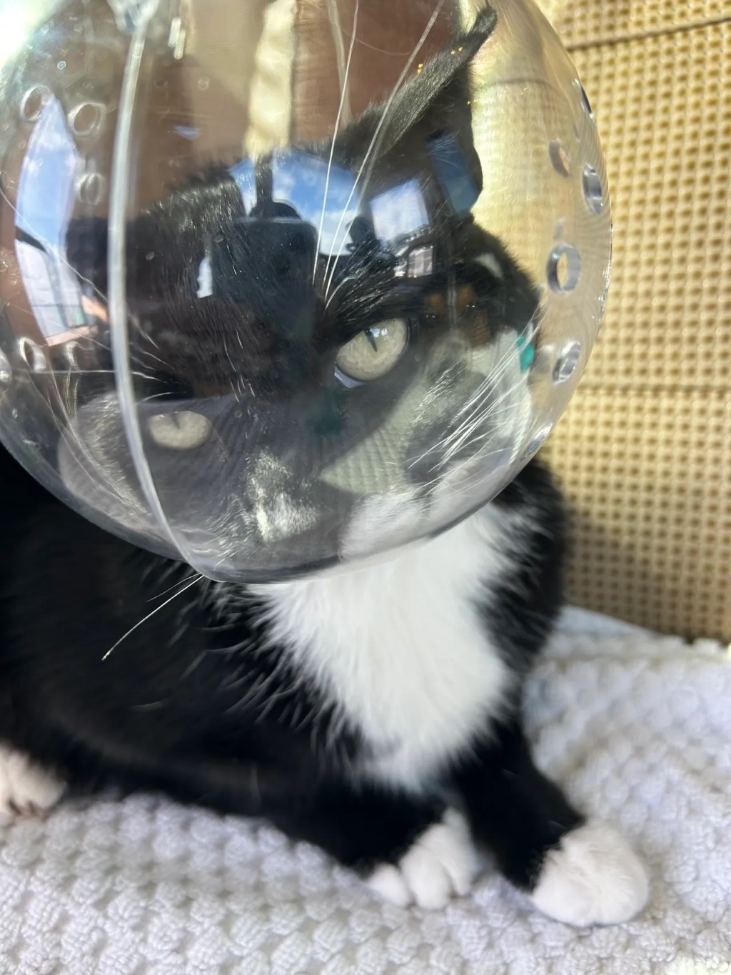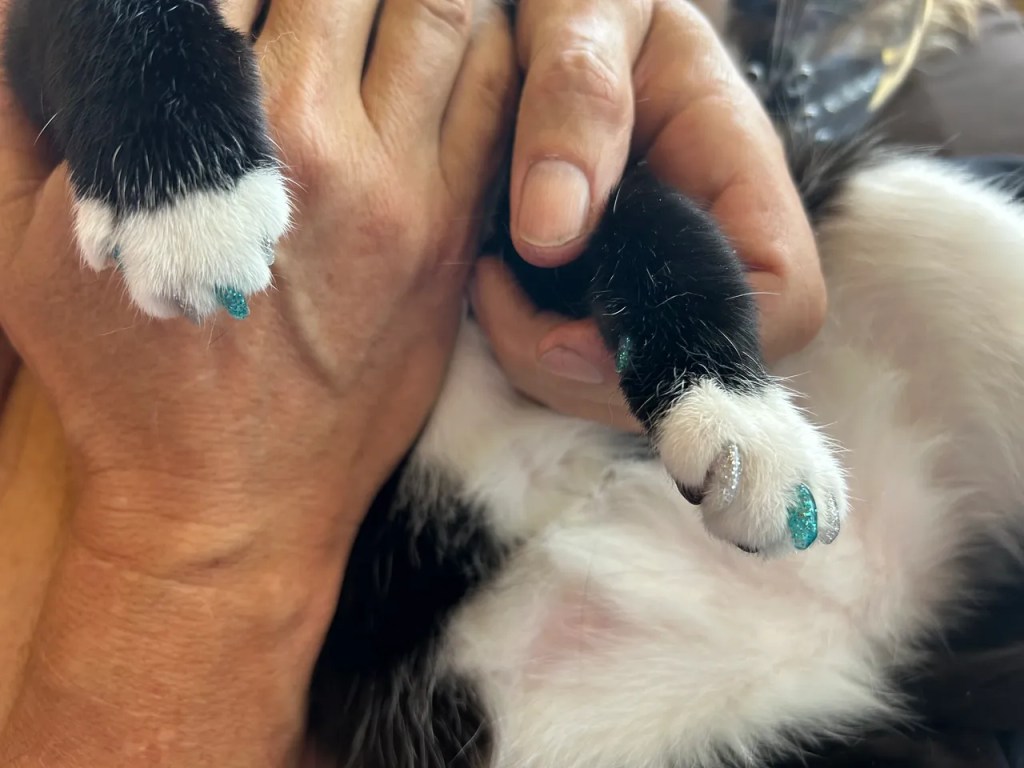 And so, Frankie’s parents did what any loving cat parents would do: they put Frankie’s head in a fishbowl and glued glittered caps on his front claws.