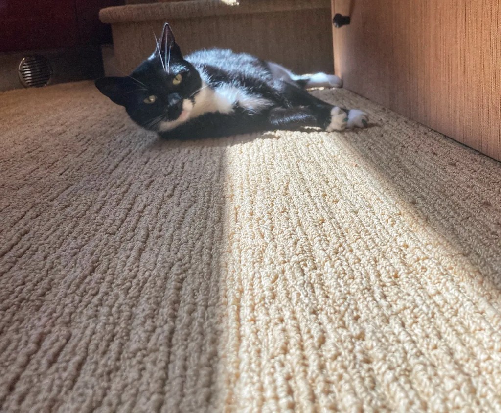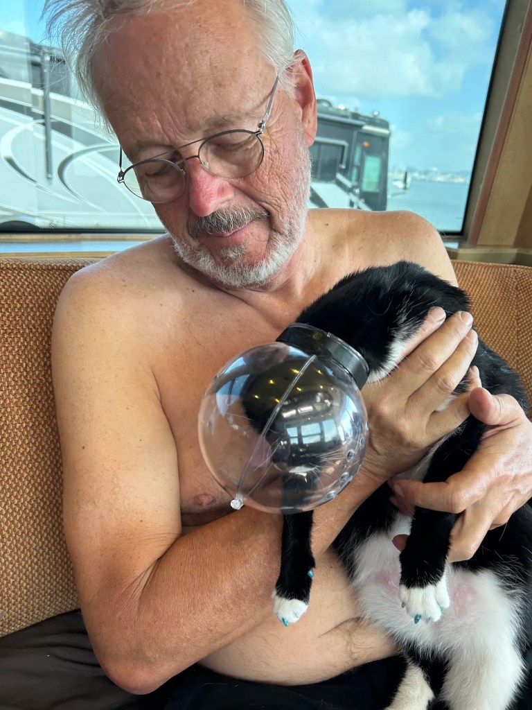 The cat helmet was something we found on Amazon (of course!). It’s quite ingenious actually: it opens in half and secures with a Velcro strap. It‘s perfect protection (for us!) as we trim his nails and glue the caps on his claws.