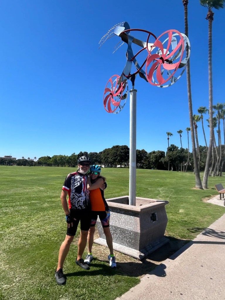Metal sculptures of bicyclists whose wheels circled with Bay breezes.