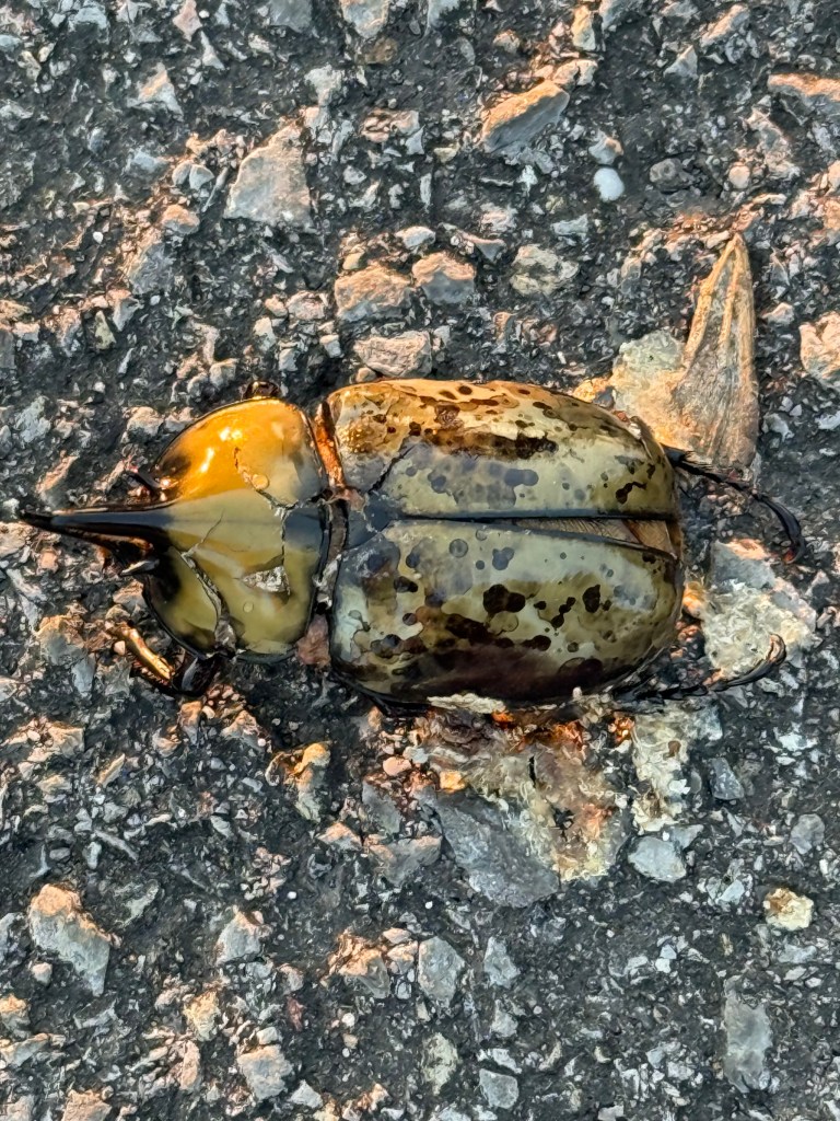 During our stay, I met the eastern Hercules Beetle. This one had met his untimely demise in the parking lot – probably throwing himself against the wall as he chased the building’s bright lights at night. Cousin Mona quickly identified the beetle when I sent her a picture of the alarming 4″ creature near my feet. The “monstrous decomposer” is the largest and heaviest insect in the U.S. They are completely harmless to everyone, happy to just eat decaying wood and fighting each other with their 2″ horns to win the affections of a female mate during their 3–6-month adult lifespan. They don’t have any predators but when they’re larvae, they make the most delicious snacks for birds. spiders, skunks and raccoons.