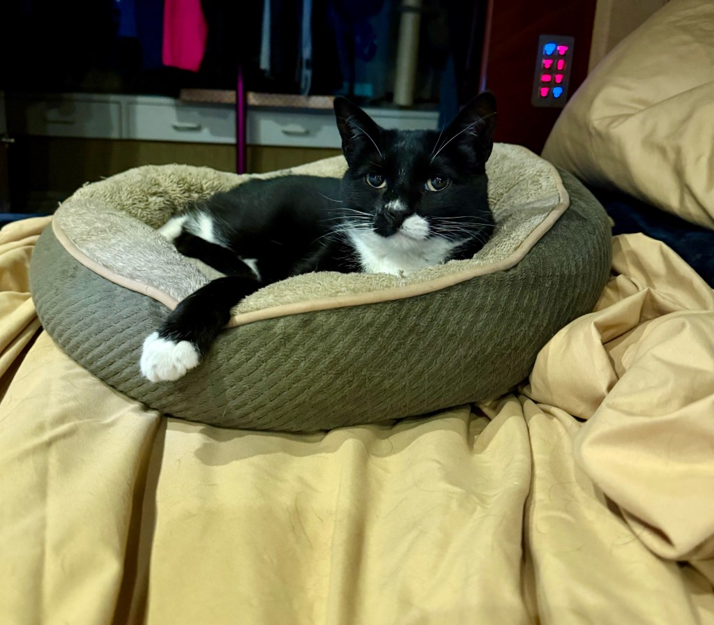 After a quick vomit (on the carpet of course), Frankie settled into his bed on the bed.