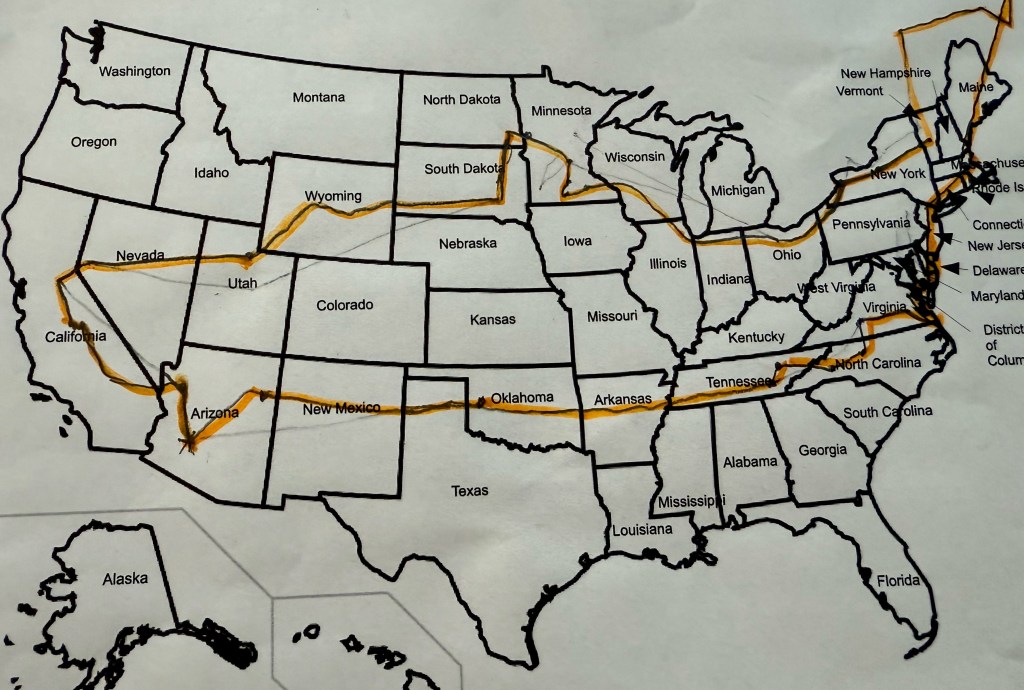 This is a beautiful, artistic, creative, magnificent drawing (courtesy of me) that basically maps out our planned trip this summer.