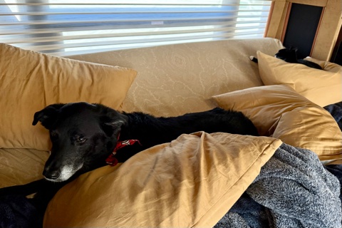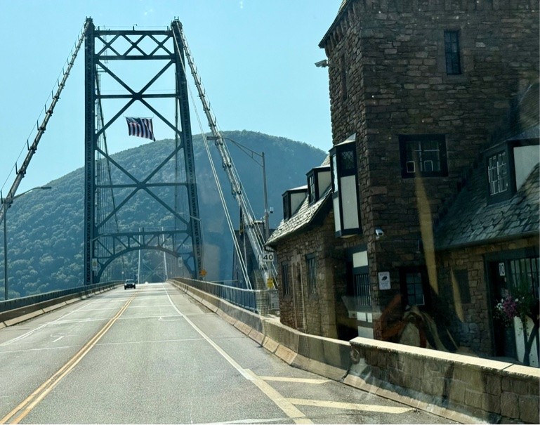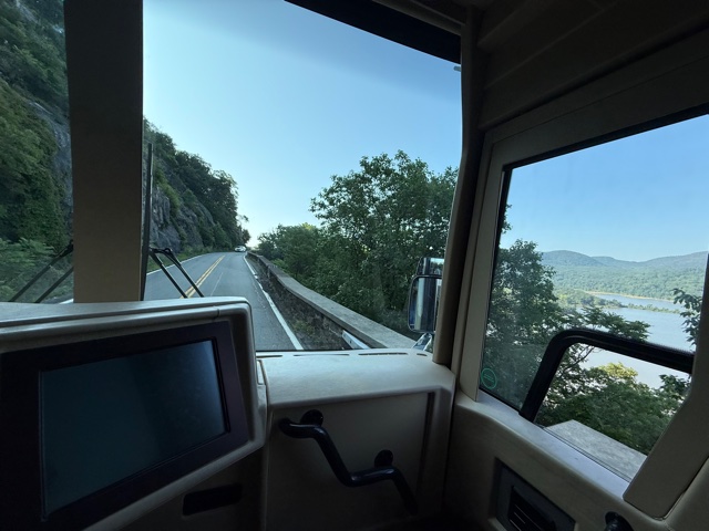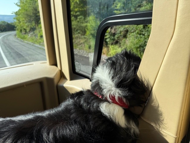 A narrow suspension bridge dared us to cross the Hudson. We started to wonder if New York wanted us to stay. Our driver welcomed – and met – the challenge!And then, New York threw us another curve ball: twisty, tight, cliff-side roads on the banks of the Hudson River. It seemed The Great State of New York was begging us to turn around and stay a little longer!Ziggy loved the up-close scent-ery! provided by the narrow roads.Austin buried himself in blankets and pillows on the bed in the back of the bus while we navigated the tight, twisty roads. Frankie (you can see him in the upper right corner) calmly slept through the entire drive.