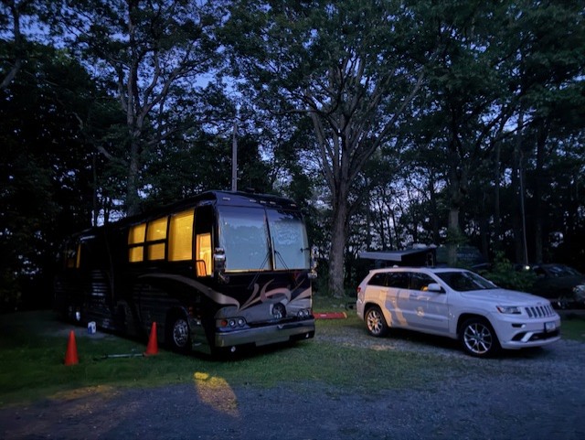 We spotted a sign for our Fam-camp and turned in. Little did we know the road into the campground would be extremely narrow and steep. Our driver took it very slow and made sure to lift Tink’s butt, so she didn’t scrape her delicate bottom.
