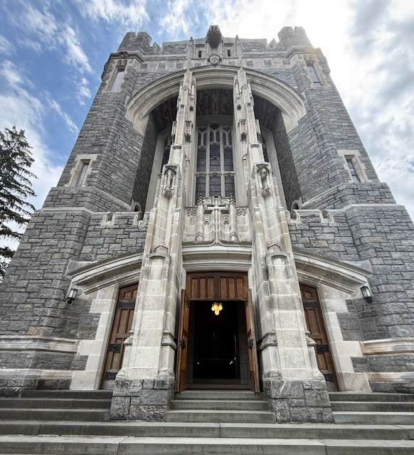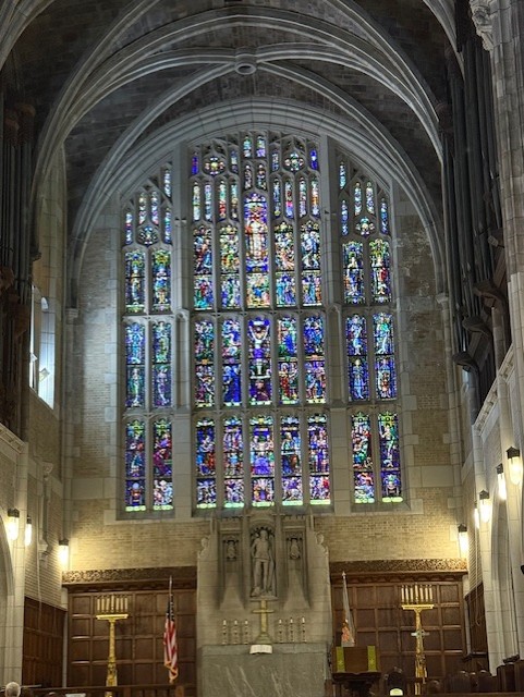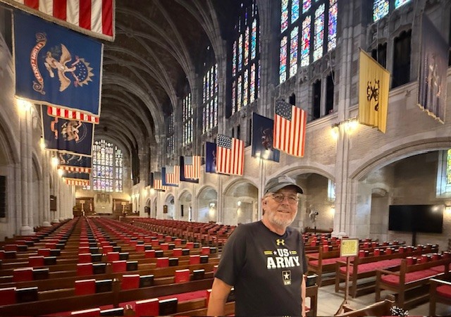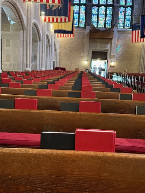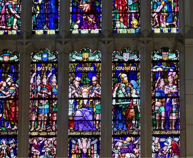 We saw a group of Plebes who were learning the cost of not knowing the West Point Book of Conduct. Each Plebe is expected to be able to hold the book at arm’s length (for a long period of time) and read it aloud. If they make a mistake or cannot answer a question correctly, the entire formation must drop and do pushups in the sweltering, humid heat of summer.The Chapel at West Point is an awe-inspiring, Gothic revival structure. It was completed in 1900 and features military and religious elements such as parapets, battlements (square holes in parapets to shoot through), castle towers and stained-glass windows.A 50-foot stained-glass window is the centerpiece of the Chapel.I doubt you’d find another place of worship with the words, “Duty. Honor. Country.” in the prominent Sanctuary Window.…or battle and country flags hanging in the SanctuaryJay was enamored with the “dress-right-dress” formation of the books in the pews.The view from the Chapel was amazing. The Chapel “looks over” the Cadets: the buildings to the right are the Cadets’ dormitories. Apparently, another Cadet failed the Book of Conduct test. This time, the Plebes got to build their quadricep and glute muscles with long squat holds.
