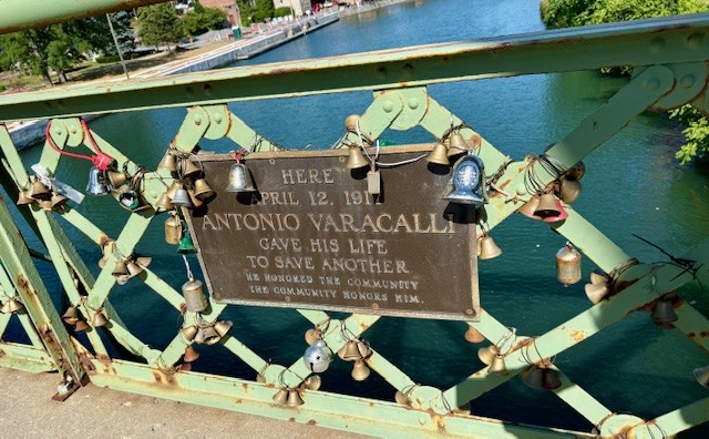 In Seneca Falls, in 1917, a 17-year-old, newly arrived immigrant named Antonio Varacalli lost his life while valiantly saving a local woman. She tried to commit suicide by jumping off the town’s bridge (pictured above). Varacalli was a Barge Canal worker who was diligently saving his money to pay for the rest of his family to join him in America. He saw the young woman in the water and jumped in to save her, even though he himself could not swim. He was able to get her near the shore where another man carried her in, while Varacalli drowned in the cold, rushing waters.