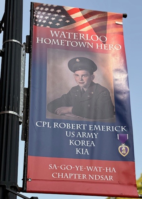 The vegetable stands in Waterloo are on the honor system – you simply deposit cash in the cash box. There’s even a calculator in case you need to do some arithmetic. A quick pic of downtown Waterloo.Interestingly, all of the public mailboxes in Waterloo are painted an Army green and sealed shut. I only noticed this phenomenon because I wanted to mail some postcards. I had to wait until the post office opened on Monday to mail my musings to our friends across the country.We took note of the placards hanging from the streetlights throughout downtown Waterloo. Each placard features a resident who served in one of our country’s wars.“Waterloo: The Birthplace of Memorial Day” makes a point of publicly honoring the town’s veterans.We toured the National Memorial Day Museum, which is in downtown Waterloo.