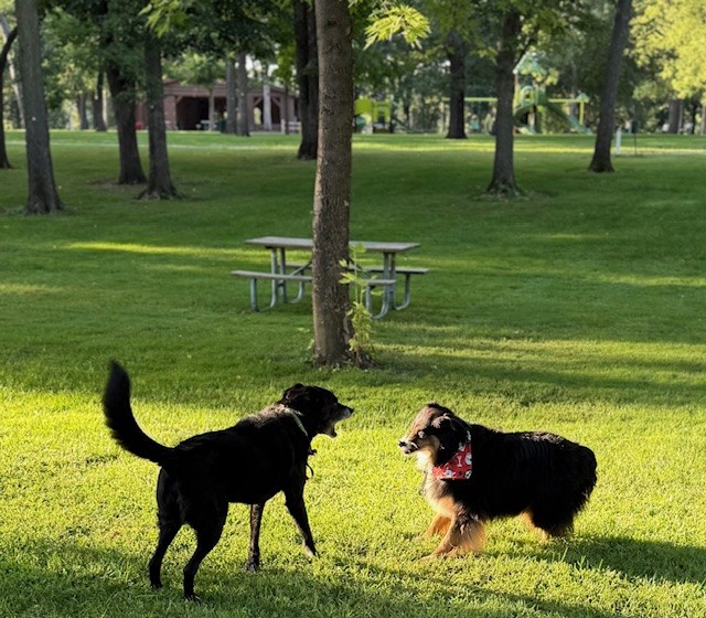 Ziggy and I enjoyed miles of walks through the woods and around the soccer and softball fields. The park straddles both sides of the Red River, separating North Dakota from Minnesota. Jay said he remembers 10,000 years ago when the Red River Valley was under a large glacial lake called Lake Agassiz.