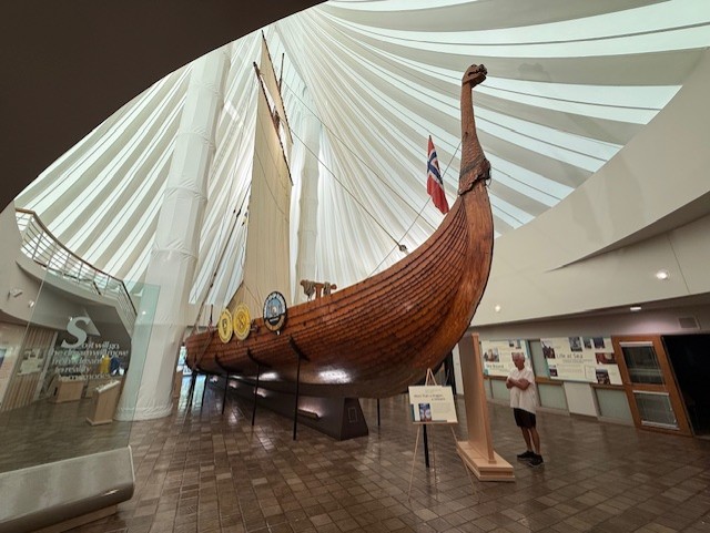What brought us to the Center was not the Stave church (although that was interesting and we learned a lot about medieval churches). What brought us here was the genuine Viking ship that was built by hand in 1974 and sailed with a crew of 12 (one woman!) across the Atlantic from Duluth to Oslo.