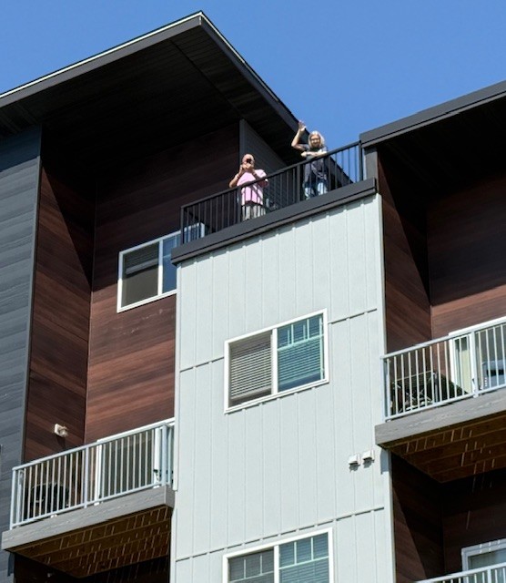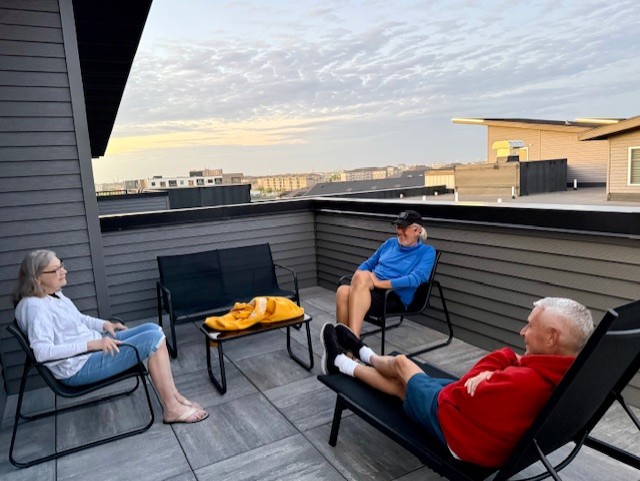 Mona and Kerry have a spacious penthouse apartment with a patio that overlooks the skyline of Fargo.